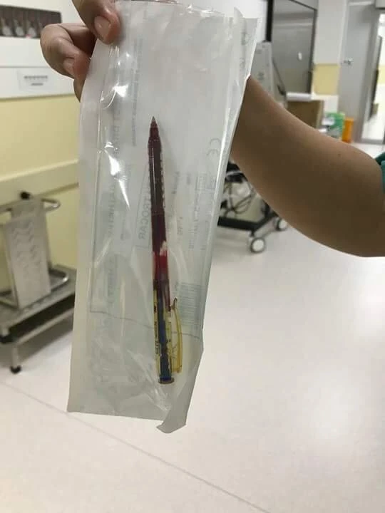 Cây bút bi được lấy ra khỏi ngực bé gái. Ảnh: BV