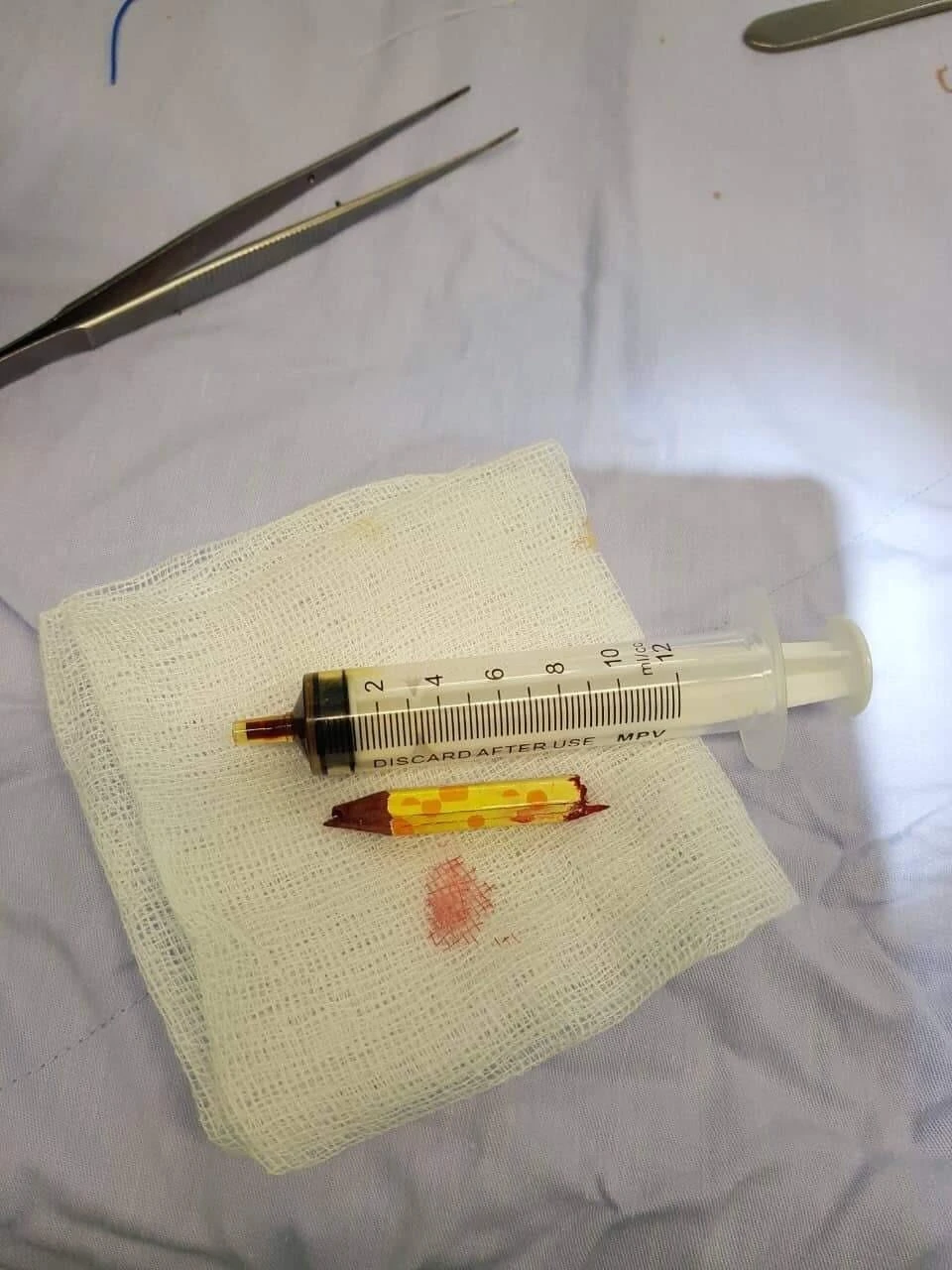 Đầu bút chì được rút ra từ mũi bé V. Ảnh: BSCC