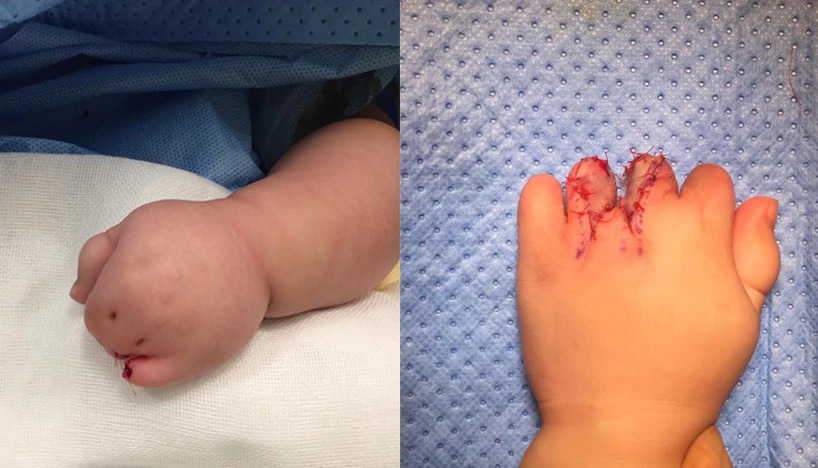 Trước đó, vào ngày 23-10, bé gái nhập viện để thực hiện phẫu thuật tách ngón. Kết quả khám và chụp X-quang cho thấy bé bị thiểu sản các xương ngón tay và dính ngón.