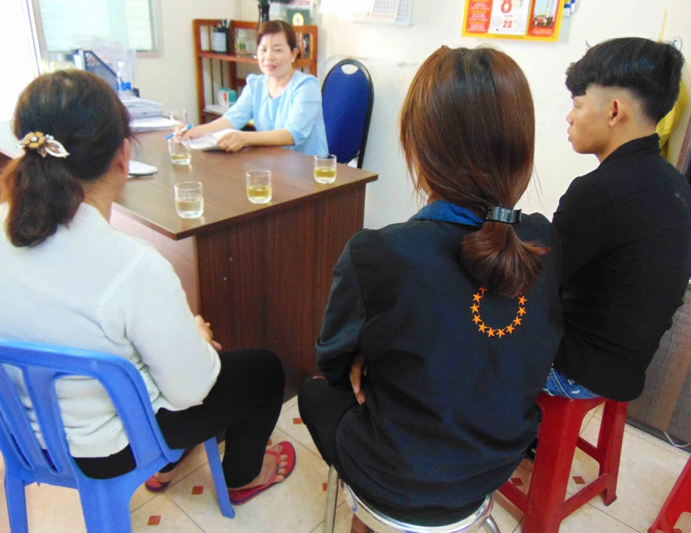 Bà Mai Lệ Hằng đang trao đổi vụ việc liên quan với bà Ng. và vợ chồng chị H. Ảnh: TRẦN NGỌC