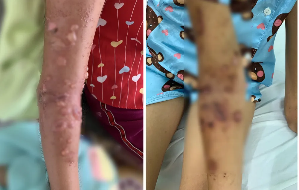 Vùng da bé gái lúc mới nhập viện và sau điều trị một tuần sau khi tiếp xúc sứa biển. Ảnh: BVCC