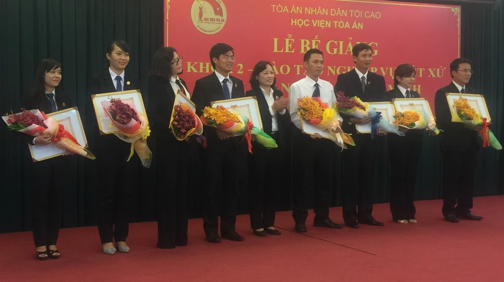 Chánh án TAND TP.HCM Ung Thị Xuân Hương (giữa) trao giấy khen và hoa cho các học viên có thành tích học tập tốt.