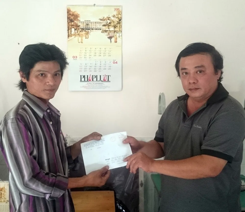 Đại diện Báo pháp luật TP.HCM trao tiền của bạn đọc ủng hộ bé Kim Ngân cho ba của bé.