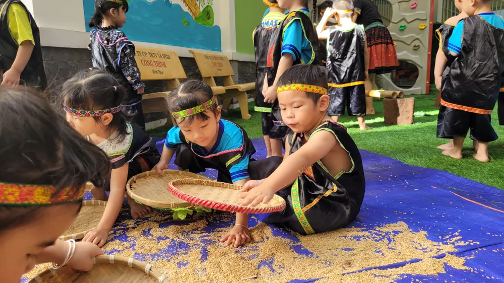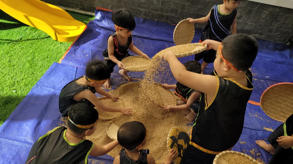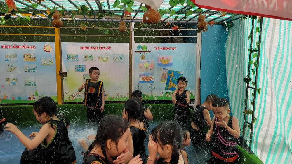 Bé Khánh Vy, lớp Chồi 1 thích thú reo hò cùng các bạn khi được tham gia các trò chơi: "Thích quá cô ơi. Con được gánh nước nè, sàn gạo, nhảy sạp nữa nè. Mà con không gánh nước nữa đâu vì con sợ té. Con thích nhất là trò tăm mưa, con thích tắm hoài luôn!".