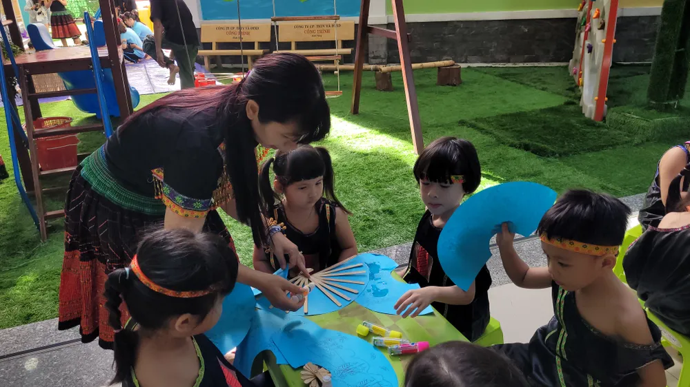 Chương trình diễn ra trong khuôn viên của trường, sáng 3-2-2023. Các cô đã tận dụng hết sảnh và sân chơi phia trước làm không gian cho các con được trải nghiệm.