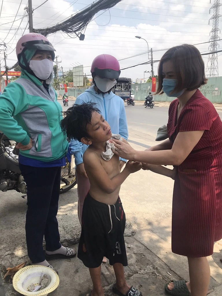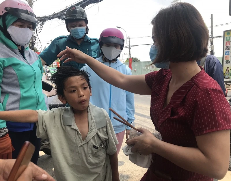 Người dân đã dùng khăn lau người và thay đồ mới cho em. Nhiều người cho biết họ thấy em cứ chạy ra chặn đầu xe lớn. Ảnh: THANH TUYỀN