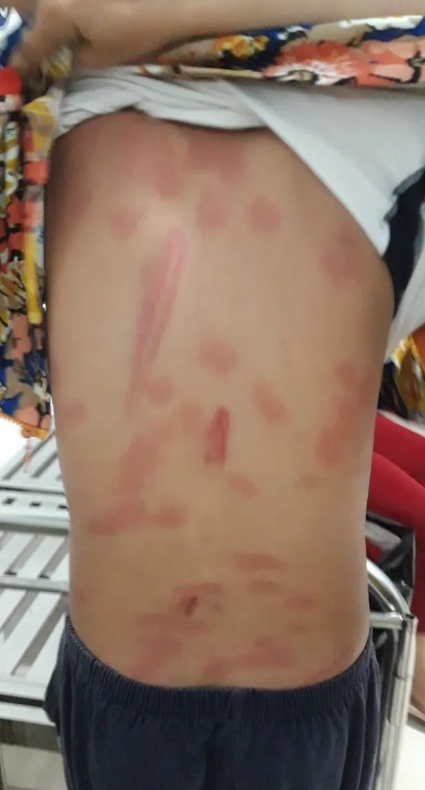 Cũng theo bà Linh, do H. bị thương nặng nên được người nhà đưa đến Bệnh viện Đa khoa khu vực Cai Lậy để điều trị trong tình trạng sưng đỏ khắp lưng và hông trái. Theo giấy chứng nhận thương tích của Bệnh viện Đa khoa Khu vực Cai Lậy, bé H. bị tổn thương nông tác động nhiều vùng trên cơ thể (đa chấn thương phần mềm vùng ngực, lưng) khai do bị đánh.