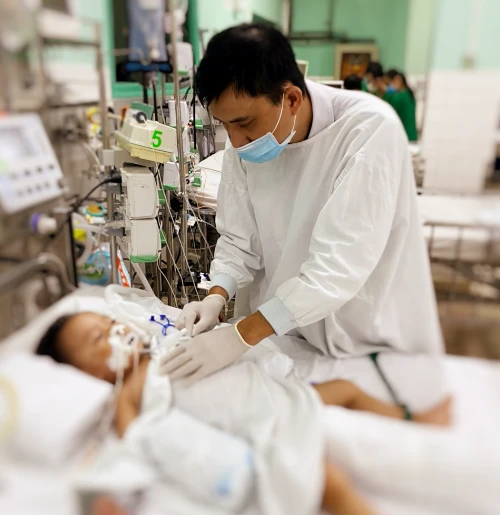 Tại bệnh viện, nhận thấy tình trạng nguy hiểm tính mạng của bệnh nhân, trong vòng 5 phút từ lúc nhập viện, bệnh nhi được chuyển đến phòng mổ. Toàn bộ tua trực được huy động ngay lập tức để sẵn sàng cho mọi tình huống xảy ra.