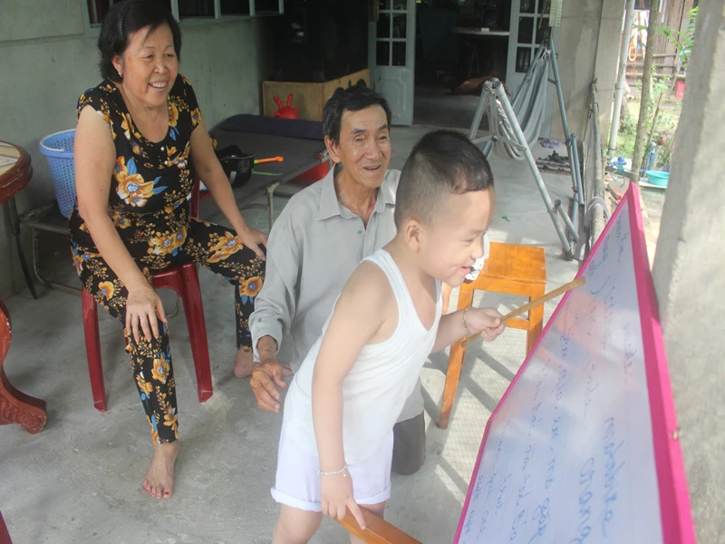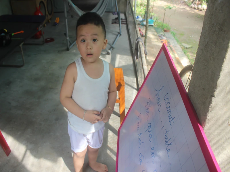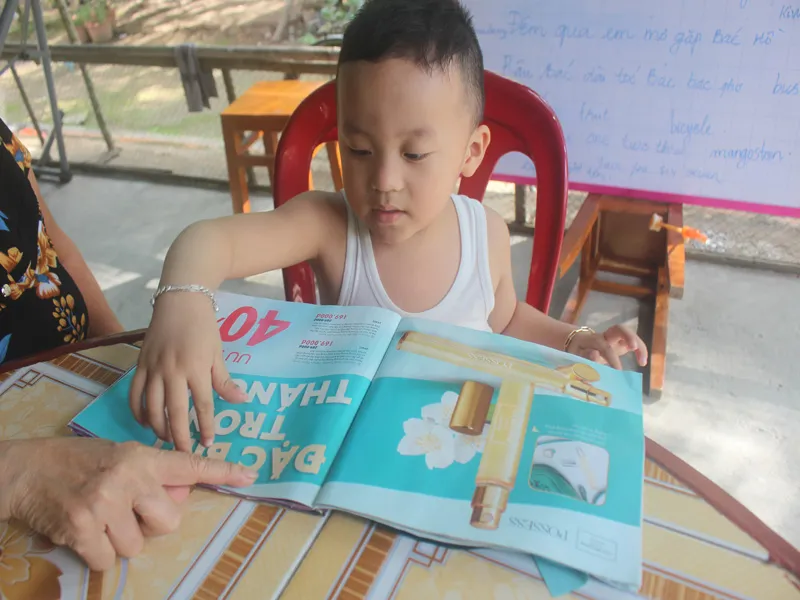 Bé Tuấn Khang đọc rành mạch cả tiếng Việt và tiếng Anh khiến ông bà ngoại ngỡ ngàng. Ảnh: ĐÔNG HÀ
