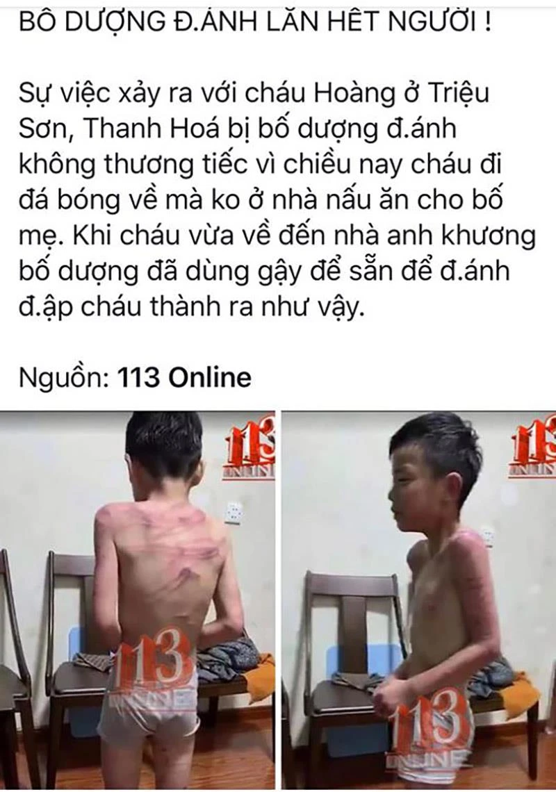 Nôi dung sự việc được đăng tải trên Facebook nêu: “Vì cháu đi đá bóng về mà không ở nhà nấu cơm cho bố mẹ. Khi cháu về đến nhà, anh Khương bố dượng đã dùng gậy chuẩn bị sẵn để đánh đập cháu ra như vậy”.