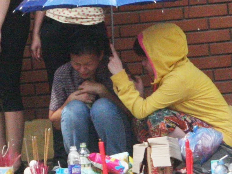 Người mẹ này ngồi trên miệng cống suốt cả ngày đêm chờ tin con. Ảnh: VH