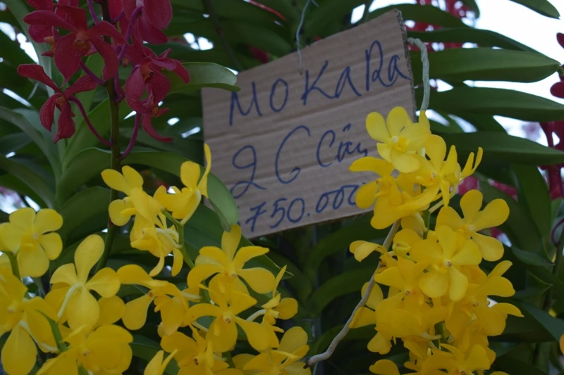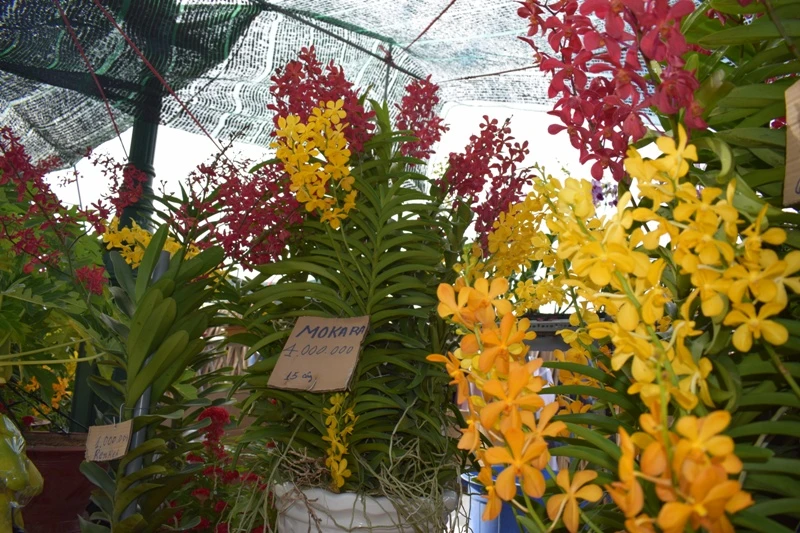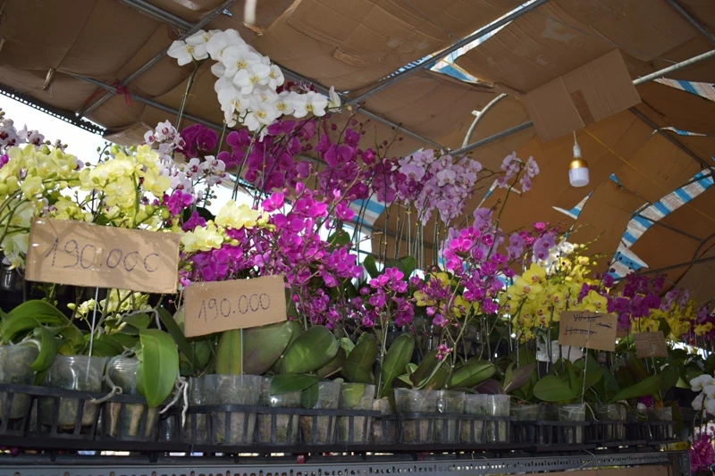 Cả hàng dài cây số dọc con bến sặc sỡ mào gà, vạn thọ, lan hồ điệp, quất, mai thi nhau khoe sắc. Nhiều chủ vườn ghi luôn giá cả lên cây để người mua dễ lựa chọn, đảm bảo không bị nói thách. Trái ngược với hình ảnh rực rỡ đó là nụ cười buồn hiu của những người làm vườn, tiểu thương.