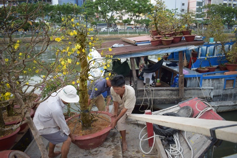 Bưng một chậu mai từ dưới thuyền lên bờ không hề dễ dàng. Ành: NGUYỄN TRÀ