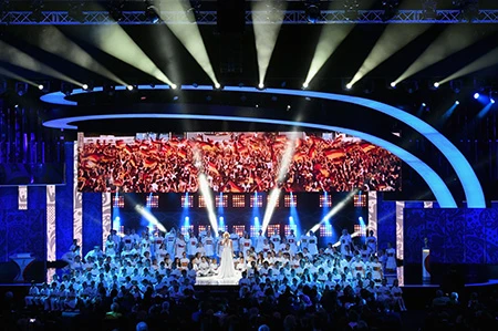 Ca sĩ Polina Gagarina trên sân khấu nhạc kịch tại lễ bốc thăm