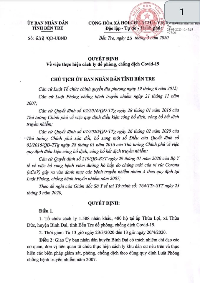Ngày 23-3, Chủ tịch UBND tỉnh Bến Tre Cao Văn Trọng ra quyết định tổ chức cách ly 1.588 nhân khẩu, 480 hộ tại ấp Thừa Lợi (xã Thừa Đức, huyện Bình Đại, Bến Tre) để phòng, chống COVID-19. Thời gian cách ly từ 13 giờ ngày 23-3 đến 13 giờ ngày 20-4.