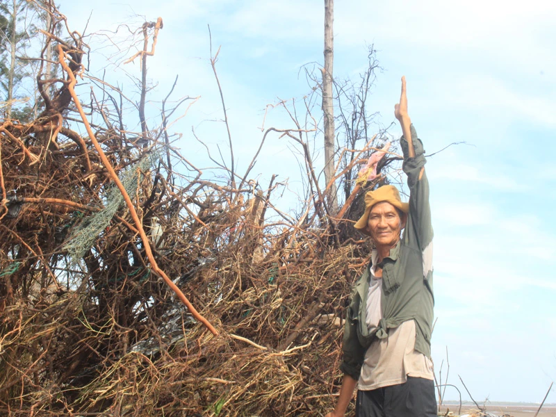 Đứng thẫn thờ bên hàng phi lao bị sóng biển đánh trơ gốc rễ nằm ngả nghiêng ngoài bãi biển, ông Nguyễn Văn Hưởng (68 tuổi, người dân ở Cồn Lợi) buồn rầu cho biết từ nhiều năm nay sóng biển đã ăn sâu vào đất liền khu vực Cồn Lợi hàng cây số. “Nhà tôi có chín công đất, chỉ mới hơn một năm nay thôi sóng biển đã cuốn mất của gia đình tôi hơn ba công đất. Nhìn cảnh sóng biển cuốn trôi đất hằng ngày, tôi thấy xót ruột lắm" - ông Hưởng thở dài nói.