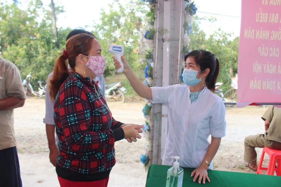 Kiểm tra thân nhiệt, khai báo y tế trước khi vào khu vực nhận phiếu bầu. Ảnh Đông Hà.