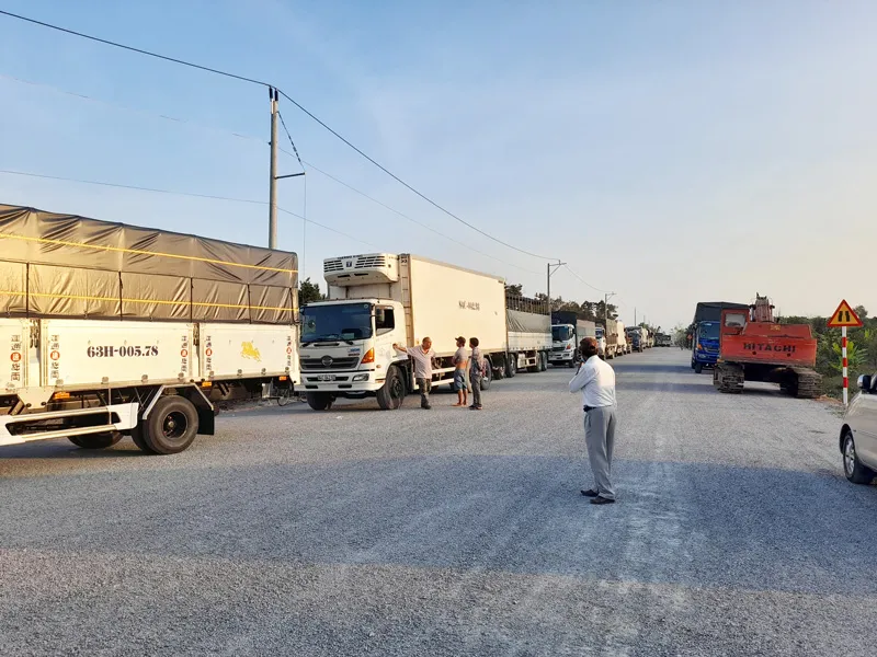 Do thiếu phà nên những ngày đầu hoạt động, bến phà Rạch Miễu tạm thường xuyên xảy ra ùn tắc giao thông. Ảnh: ĐH