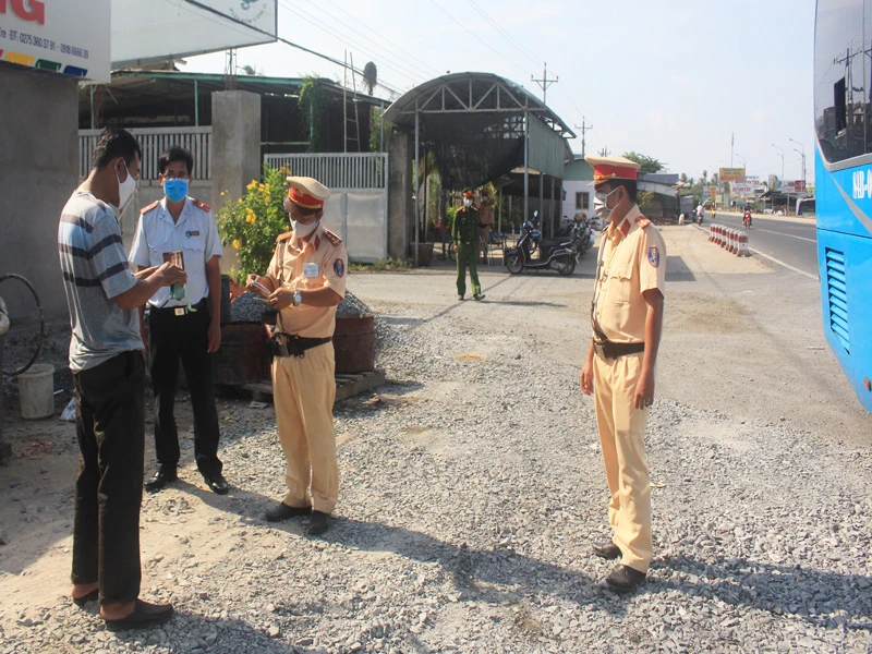 Thực hiện kiểm tra đối với tài xế xe khi đi vào địa bàn tỉnh Bến Tre. Ảnh: ĐH