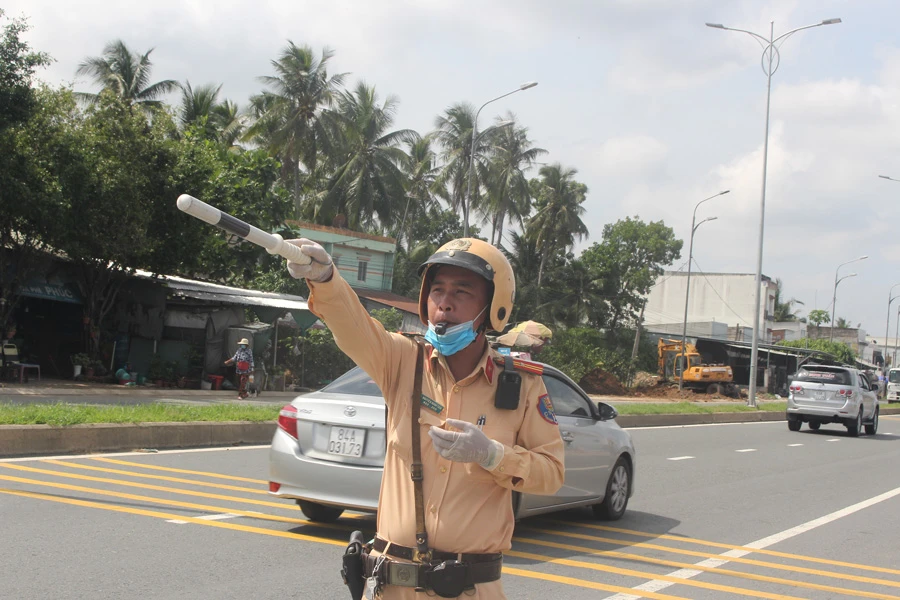 CSGT ra hiệu lệnh dừng xe chở khách để kiểm soát dịch bệnh. Ảnh: ĐH