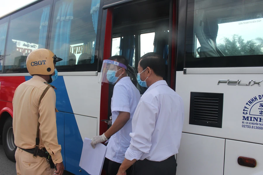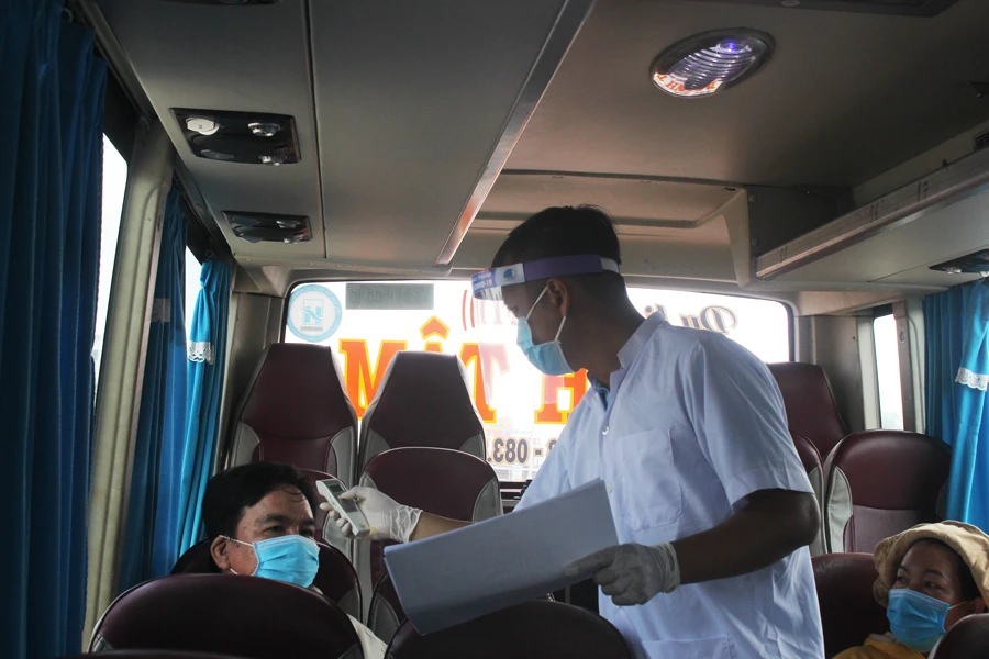 Đo thân nhiệt hành khách trên xe trước khi vào địa bàn tỉnh. Ảnh: ĐH