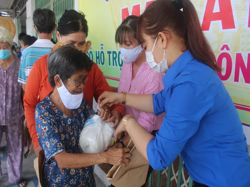 Người già đi lại khó khăn được các tình nguyện viên trao gạo, trứng gà đến tận tay.