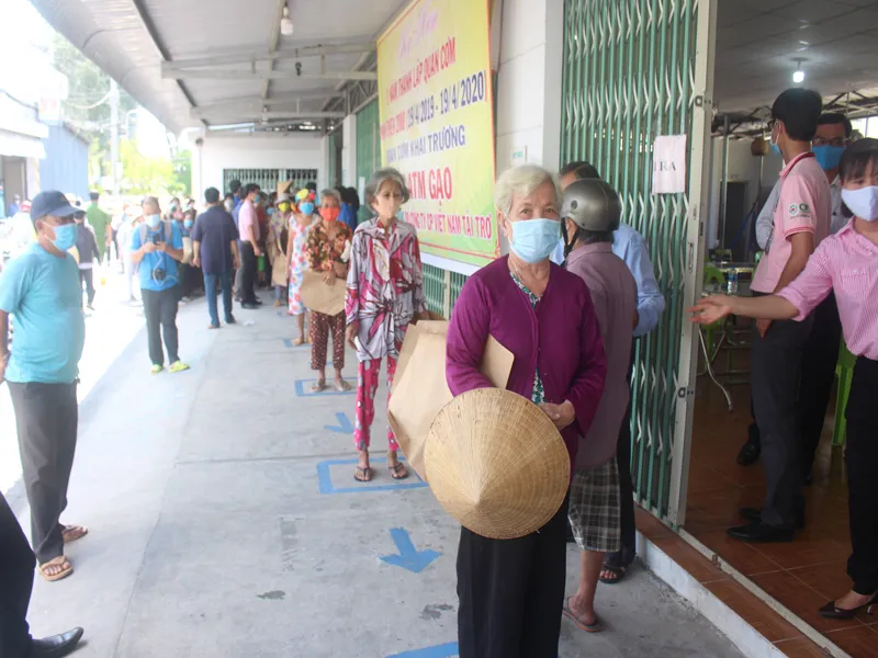 Người dân tuân thủ xếp hàng giãn cách để chờ nhận gạo.
