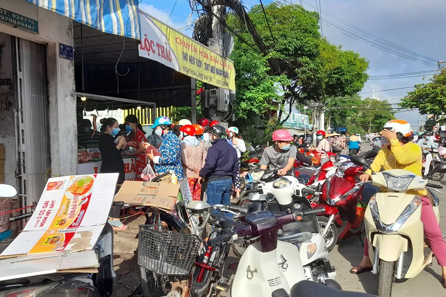 Tại chợ Lạc Hồng (phường Phú Khương, TP.Bến Tre), dòng người nườm nượp ồ ạt đổ về khu chợ từ sáng sớm tranh thủ mua thực phẩm. Do sức mua tăng cao nên đến khoảng 7 giờ 30 sáng nhiều quầy thịt, rau củ quả bên trong chợ đã bán sạch. Tại một số tuyến đường, người dân lấn chiếm lề đường bán hàng rong, sức mua tập trung đông không kém gì chợ.