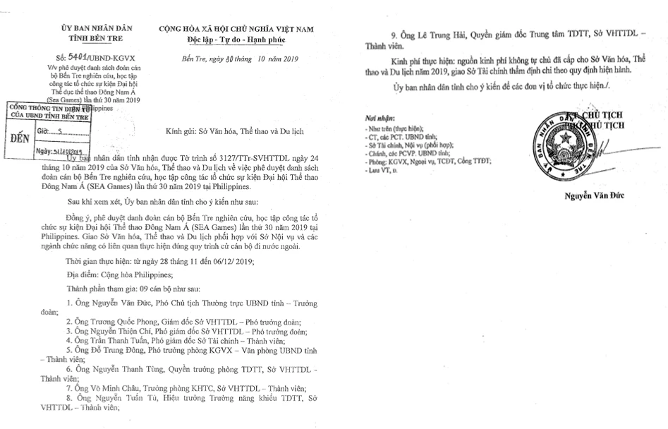 Công văn số 5401 do Phó Chủ tịch thường trực tỉnh Bến Tre Nguyễn Văn Đức ký ngày 30-10 phê duyệt danh sách chín người đi học tập tổ chức SEA Games.