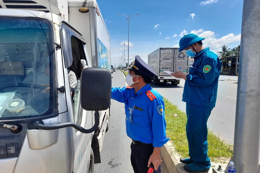 Lực lượng làm nhiệm vụ kiểm soát dịch bệnh tại chốt kiểm soát cầu Rạch Miễu, trên quốc lộ 60. Ảnh: ĐH