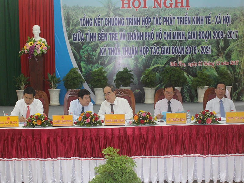 Ông Nguyễn Thiện Nhân, Ủy viên Bộ Chính trị, Bí thư Thành ủy TP.HCM; ông Nguyễn Thành Phong, Ủy viên Trung ương Đảng, Chủ tịch UBND TP.HCM và lãnh đạo tỉnh Bến Tre cùng tham dự hội nghị này.