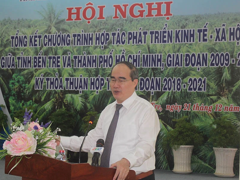 Phát biểu tại hội nghị ông Nguyễn Thiện Nhân, Bí thư Thành ủy TP.HCM, bày tỏ sự phấn khởi trước kết quả đạt được trong chương trình hợp tác giữa Bến Tre-TP.HCM trong tám năm qua.