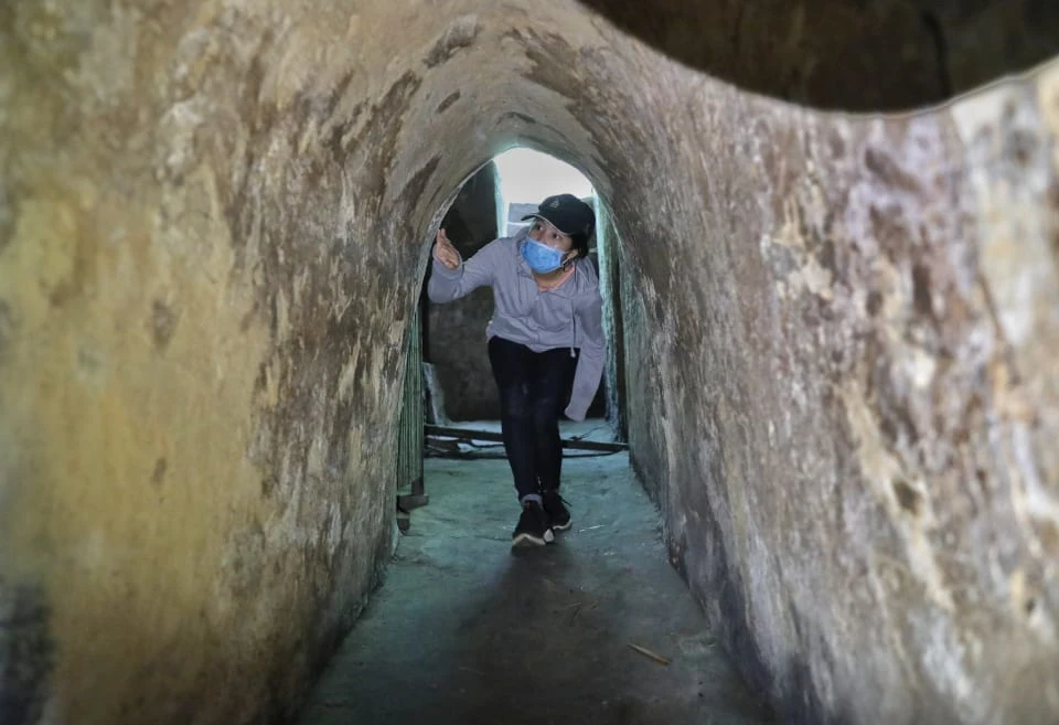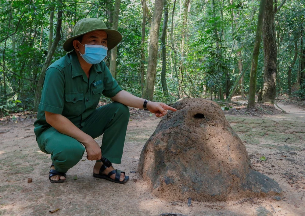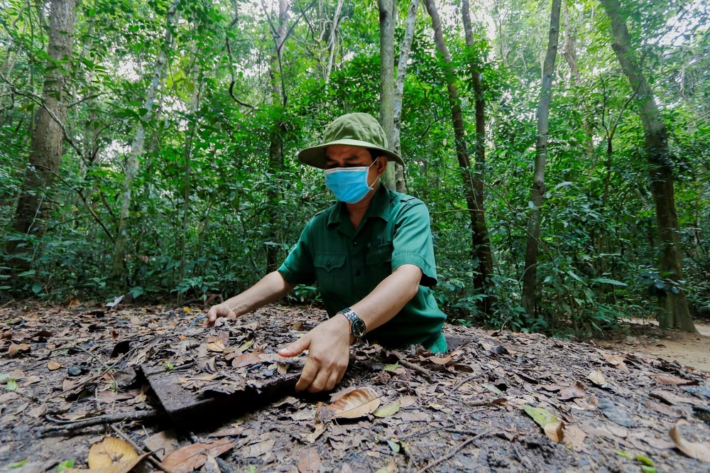 Anh La Văn Hoạch (hướng dẫn viên) mô phỏng cách chui qua cửa hầm dẫn vào địa đạo. Cửa hầm được thiết kế vừa với thân hình bộ đội Việt Nam, cửa được ngụy trang trên mặt đất rất kỹ.