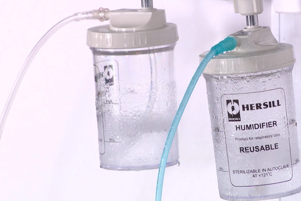 Bình tạo ẩm oxy trước khi cho bệnh nhân thở.
