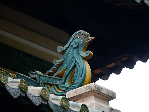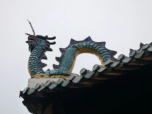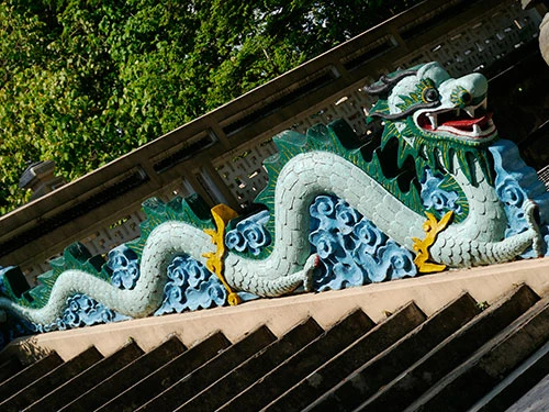 Hai bên bậc hành lang lên xuống có đặt 2 con rồng uy nghi, thực hiện việc canh giữ đền.