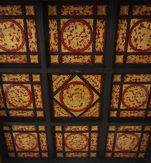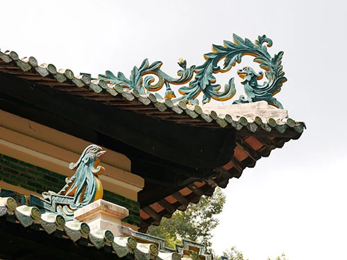 Các họa tiết trang trí có hình rồng và phượng theo thể cung đình. Các bậc đá lên xuống các cửa, hai bên đều có đôi rồng chầu.