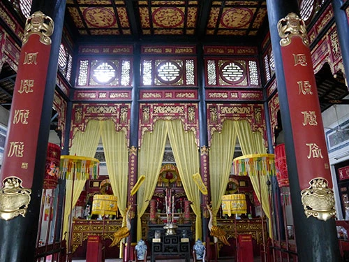 Đền được chống đỡ bằng 12 cây gỗ mật màu đen bóng, đường kính khoảng 50 phân, tượng trưng cho thập nhị chi: Tý, Sửu, Dần, Mẹo...