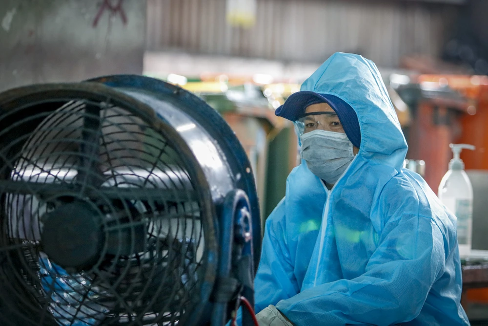Anh Lê Thanh Hiền, công nhân khu vực lò đốt rác hong mát người bằng chiếc quạt công nghiệp trang bị trong khu vực lò đốt. Có 18 năm làm tại nhà máy xử lý chất thải nguy hại, anh Hiền cho biết đây là thời điểm những công nhân như anh làm việc gấp 2 lần so với bình thường do phải xử lý lượng rác thải y tế trong mùa dịch. "Mình không làm thì người khác cũng phải làm, dù có vất vả nhưng mình và các anh em luôn cố gắng góp chút sức để chống dịch", anh Hiền nói.