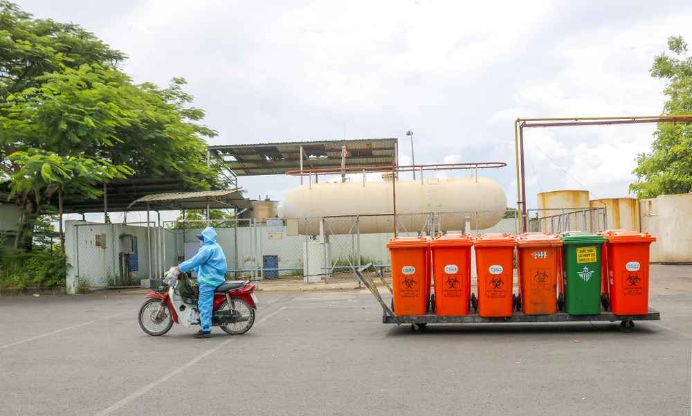 Trong khu xử lý rộng gần 1.000 m2, những thùng rác chưa chất thải y tế từ khu cách ly được để ở nơi riêng, có hàng rào ngăn cách.