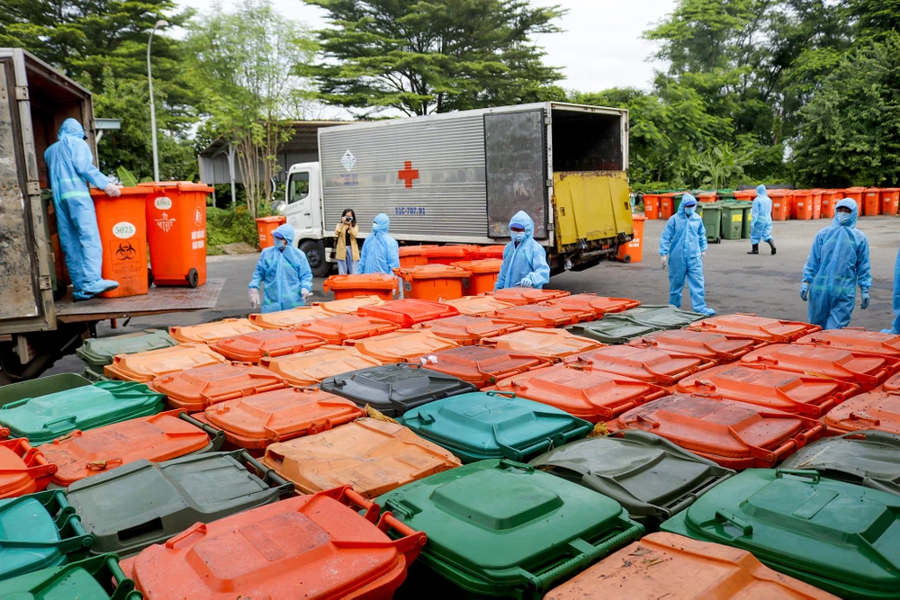 Những thùng rác sau khi được vệ sinh xong sẽ được chất lên xe để mang đến đặt tại các khu cách ly, khu phong tỏa, bệnh viện.