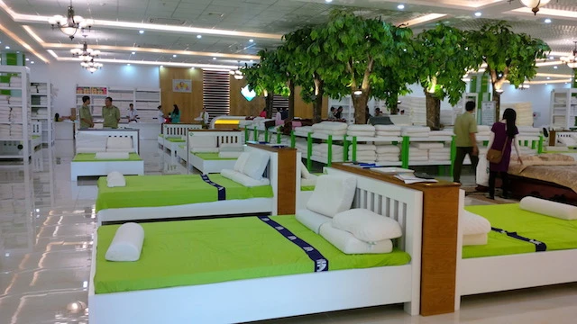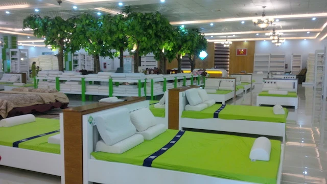 Theo quan sát của PV, showroom H.A Cao su thiên nhiên có diện tích khá rộng và được bài trí rất bắt mắt. Bên trong trưng bày các sản phẩm làm từ cao su thiên nhiên như: chăn, gối, đệm… với giá bán niêm yết trong sáng 23-12 khá mềm.