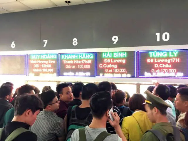 Từ 16 giờ, khu vực bán vé tại Bến xe Nước Ngầm đông kín người nên xảy ra cảnh chen chúc, xô đẩy nhau mua vé. Các hãng xe cũng liên tục thông báo với hành khách hết vé hoặc phải mua ghế phụ. Đặc biệt đến 18 giờ, các tuyến Hà Nội - Nghệ An; Hà Nội - Hà Tĩnh; Hà Nội - Thanh Hóa không còn vé (Ảnh: Viết Thịnh)