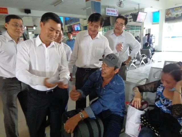 Giám đốc Bùi Xuân Cường trao đổi cùng hai vợ chồng đến bến đi xe về quê sớm trong sáng 20-1.