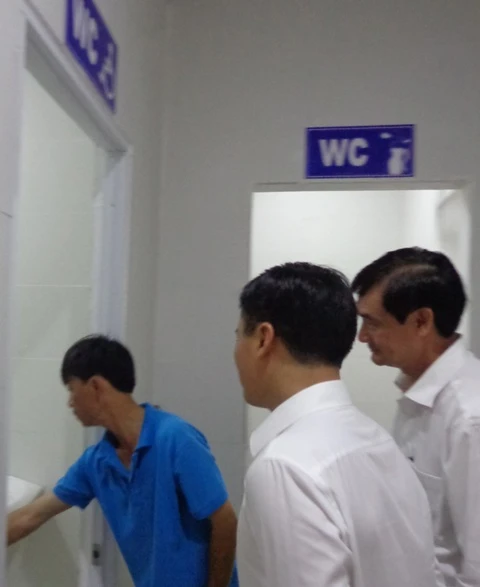 Đoàn đi kiểm tra khu nhà vệ sinh. Năm nay có thêm cả buồng vệ sinh dành riêng cho hành khách khuyết tật.