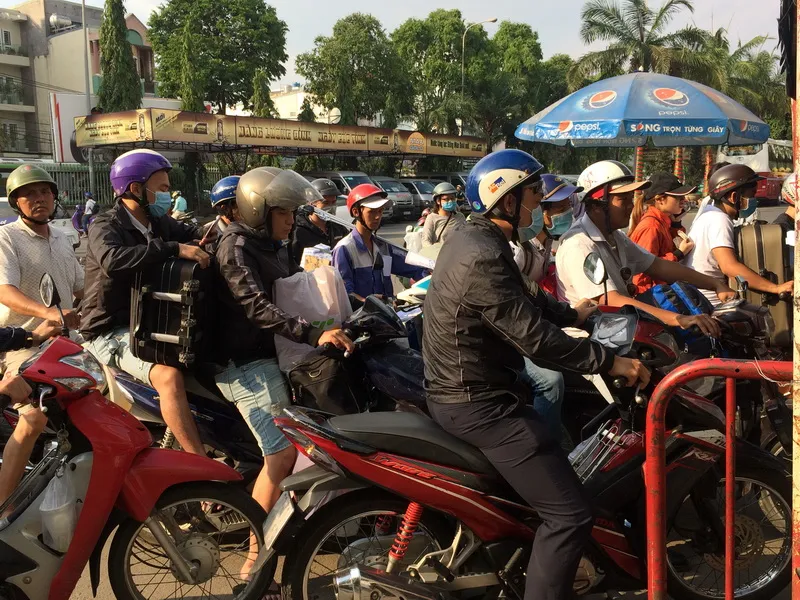Trong khi đó tại khu vực cổng vào dành cho xe máy đông kín người, xe máy chở đầy hành lý xếp hàng dài để vào bên trong.