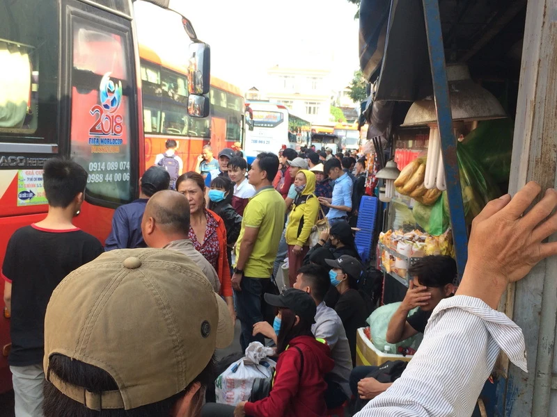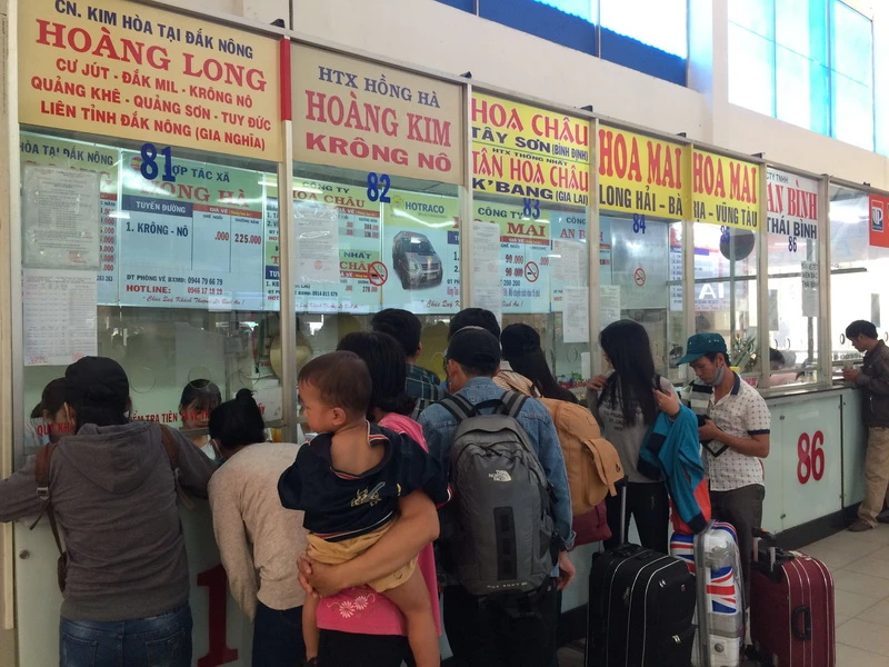 Tại các quầy bán vé, đặc biệt khu vực đi các tỉnh miền Trung như Phú Yên, Quảng Ngãi, Đà Nắng, Quảng Nam, Thanh Hóa…, người dân chen chúc mua vé. Nhiều người vì sợ đi gần chiều kẹt xe nên đến đây khá sớm để không bị lỡ chuyến xe về quê.