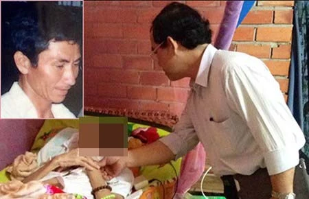 BS Nguyễn Hùng Vĩ, Phó Giám đốc Sở Y tế tỉnh Tiền Giang, đang thăm hỏi bệnh tình ông Đạt. (Ảnh do BS Vĩ cung cấp) Ảnh nhỏ: Ông Đạt trước khi mắc bệnh lạ. (Ảnh do gia đình cung cấp)