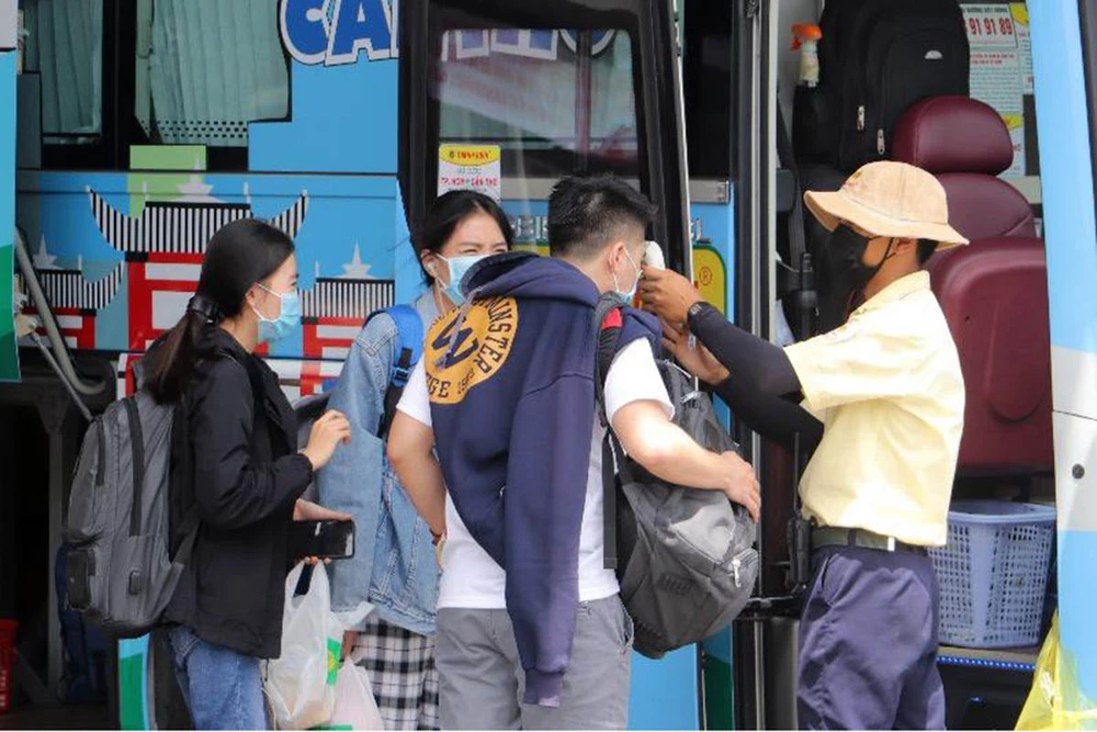 Thực hiện kiểm tra thân nhiệt cho hành khách trước khi lên xe tại Bến xe Cần Thơ. Ảnh: ANH HÀO