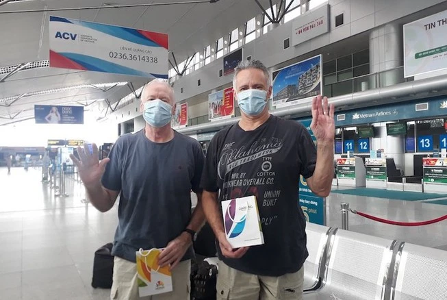Hai du khách người Anh là bệnh nhân nhiễm COVID-19 số 22 và 23 đang làm thủ tục tại sân bay Đà Nẵng để di chuyển vào TP.HCM, về nước. Tuy nhiên, BN22 dương tính trở lại. Ảnh: DL