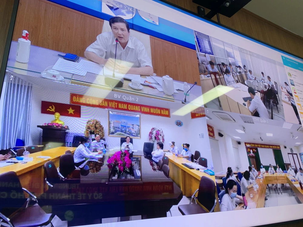 Lãnh đạo Sở Y tế TP.HCM họp trực tuyến với các Trung tâm Y tế, BV Quận, huyện bàn kịch bản chống dịch COVID-19. Ảnh: HL